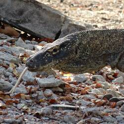 Aber zurück zu Rinca: Mit einem Guide am Anfang und einem am Ende unserer 10-Mann-Truppe, die uns mit ihren Stöckern im Falle der Fälle vor einem Waran-Angriff schützen wollten, latschten wir über die savannenartige Insel. Zum Glück waren wir auf den späten Nachmittag gekommen, denn bei Mittagshitze soll eine Wanderung dort unerträglich sein. Es dauerte auch nicht lange und wir fanden den ersten Waran, der sich die Sonne auf seinen Bauch scheinen ließ. Die Guide zeigten uns sogar die Nester der Warane - natürlich nur aus der Ferne. Obwohl die Warane selbst nicht giftig sind, ist ein Biss meistens tödlich, weil ihre Münder als Aaßfresser von Bakterien überseht sind, weshalb man dann eine Sepsis bekommt und an dieser stirbt. Denn machen wir uns mal nichts vor: bis zum nächsten guten Krankenhaus muss man schon einen Flug nach Singapur oder Australien bekommen. Trotzdem sind von den 33 Menschen, die jemals angeknabbert wurden "nur" 6 verstorben. Mit ein paar geknippsten Fotos auf der SD-Karte ging es ein paar Hügel hoch zu einem Aussichtspunkt über die Bucht. Auf dem Weg begleiteten uns ein paar Büffel und Hirsche - die Warane sind bei Weitem nicht die einzigen Bewohner. Wenn es im Gebüsch raschelte, kam meistens ein Huhn zum Vorschein, als der heiß ersehnte Waran. Trotzdem hatten wir ja unsere Waran-Fotos bekommen, denn zufälliger Weise war unserer Guide Matthias nicht nur Taucher, sondern auch Fotograf. ^^ Manchmal darf man auch Glück haben.