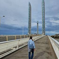 Schon vorher ging es über eine sehenswerte Brücke: An den 4 Türmen aus Stahl und Glas kann das Mittelstück waagerecht hochgezogen werden - so wird eine lichte Höhe von 53 mtr erreicht. Damit zählt sie - 2013 eröffnet - zu den größten Hubbrücken der Welt.