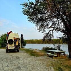Nachdem wir MAX THE MOOSE besucht hatten, ging es nur noch ein kleines Stückchen weiter: Auf einem sehr schönen Parkplatz am See finden wir den perfekten Platz für die Nacht.