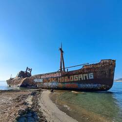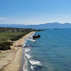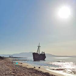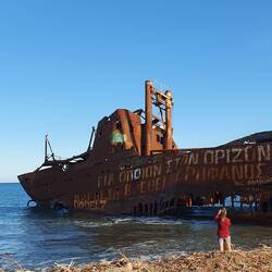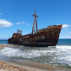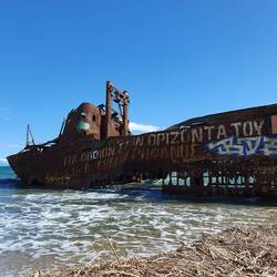 Am 23.12.1981 riss sich die DIMITRIOS in einem Sturm von der Kette und trieb hier auf den Strand. Der Zahn der Zeit bzw. das Salzwasser in Kombination mit Sauerstoff und die Wellen sorgen dafür, dassLeggi altro