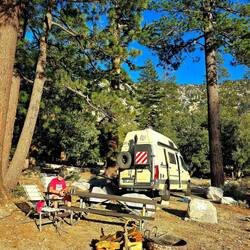 Wir sind auf einem CP im ANGELES NATIONAL FOREST gelandet. Zwar gibt es keine Dusche und "nur" Pit-Toilet - aber der Platz liegt sehr schön in einem lichten Wald (auf 1700 m üN), das Wetter ist genial (Nachts ca. 5°C - Tags ca. 13°C) - in der Sonne lässt es sich aber richtig gut aushalten. Mit $10 (da wir den NP-Pass haben) ist der Platz auch sehr günstig.