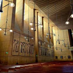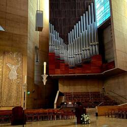 Auch die Kathedrale wurde natürlich besucht. Auch dieses Gebäude ist erst wenige Jahre alt. Die alte Kathedrale wurde durch ein Erdbeben schwer beschädigt und konnte wegen gesetzlicher Auflagen bezüglich Erdbebensicherheit nicht wieder aufgebaut werden. So kam es zu dem Neubau. Wir wurden in der Konzerthalle auf die Kathedrale aufmerksam gemacht: Wir sollen uns unbedingt die große Orgel anschauen. Aber auch die Fenster der Kathedrale sind interessant: Sie sind nicht - wie üblich - aus bemalten Bleiglasfenstern sondern aus Jade. Außerdem dürfte das für uns die erste Kirche mit eigenem Parkhaus sein .....