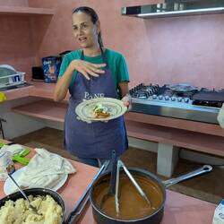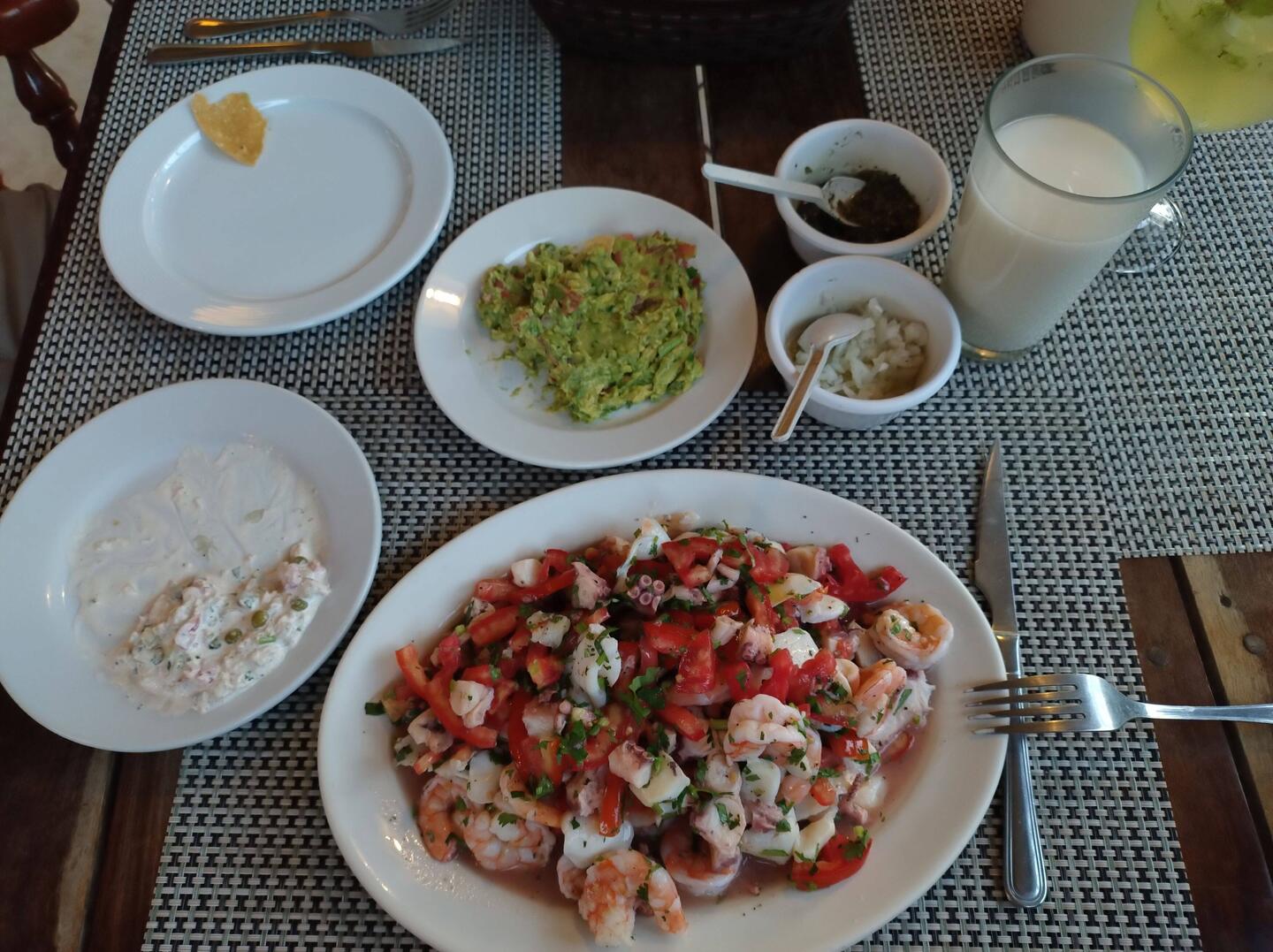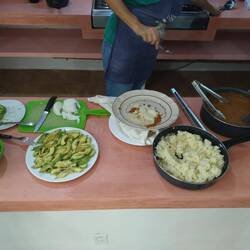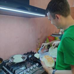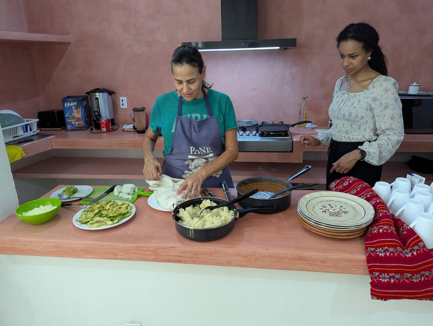 Nach unserem Spanisch-Sprechunterricht nahmen wir an einem kleinen Kochkurs teil, bei dem wir gemeinsam Tlacoyos de Frijol zubereiteten – ein traditionelles mexikanisches Gericht aus Masa-Teig und Bohnen. Wir waren zu viert und jeder packte fleißig mit an: Es wurden schwarze Bohnen gekocht und püriert, Kartoffeln gepellt und gewürzt sowie frischer Salat zur Beilage vorbereitet.