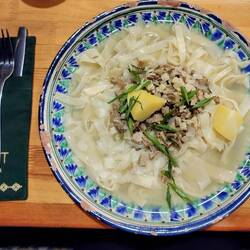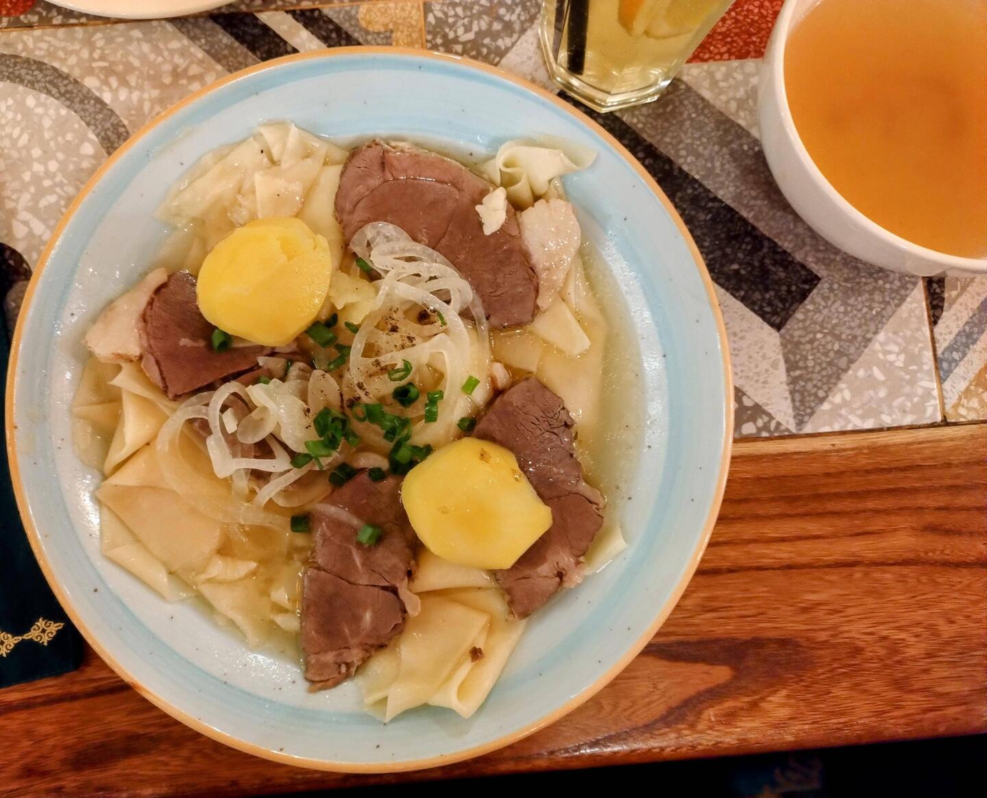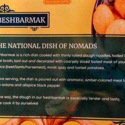 Beshbarmak ist das Nationalgericht der nomadisch lebenden Völker in Zentralasien und ist auch als Naryn bekannt. Der Name bedeutet so viel wie fünf Finger und daher kommt, dass Nomaden die Mahlzeit normalerweise mit bloßen Händen aßen.