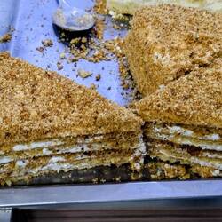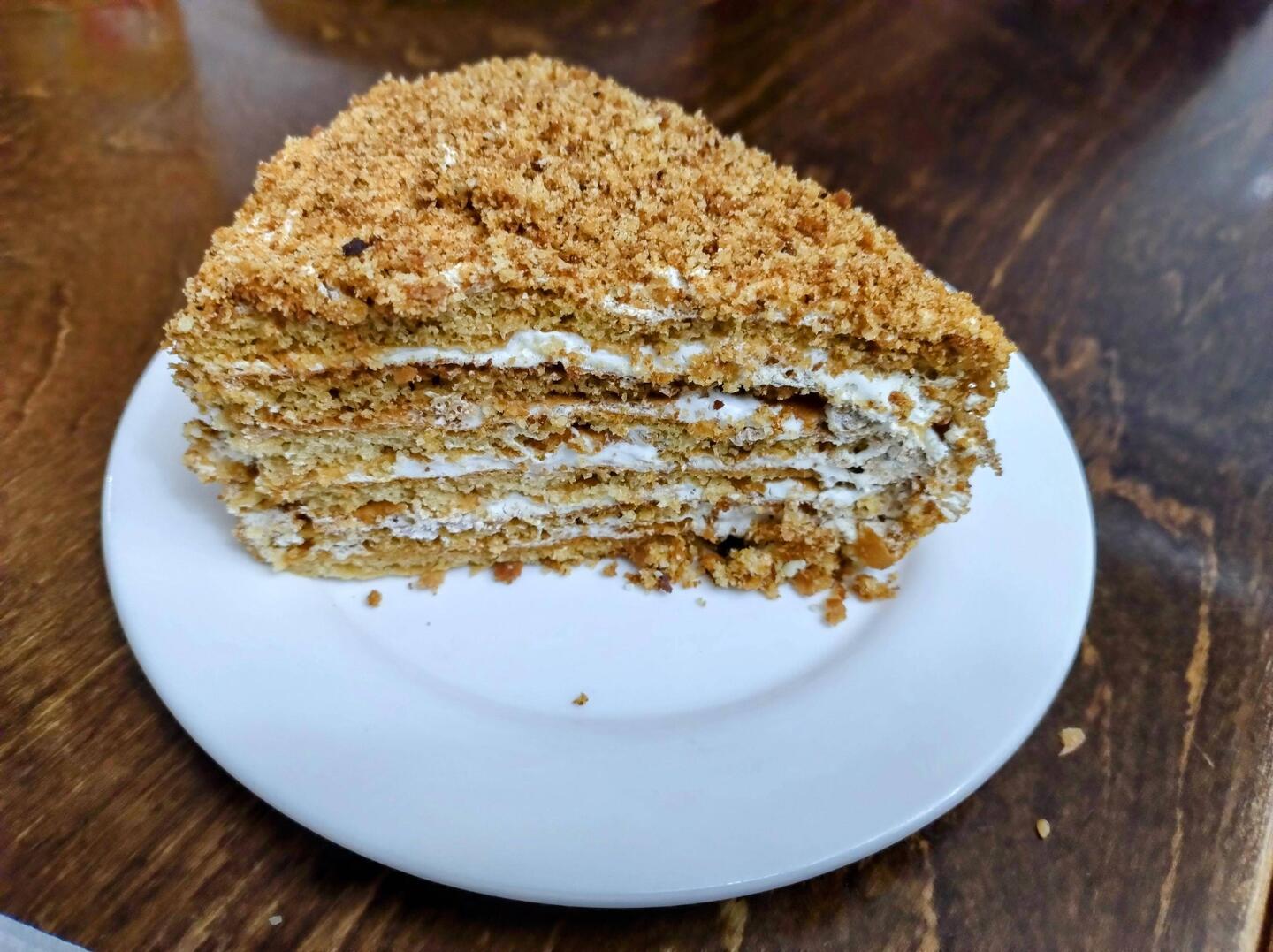 Medowik ist ein beliebter Schichtkuchen in der ehemaligen Sowjetunion. Die Hauptzutaten sind Honig und Smetana (saure Sahne) oder Kondensmilch.