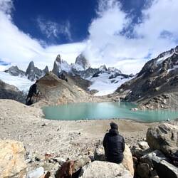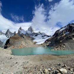 Am Abend ging es 200 km weiter in das kleine Dörfchen El Chaltén, dieses liegt am Fusse des Fitz Roy. Auf der anderen Seite der Grenze, auf chilenischem Boden, befindet sich der Torres del Paine. Nach einer windigen Nacht und Schlafplatzwechsel haben wir uns am morgen früh aufgemacht auf die Wanderung zur Lagune direkt unter dem 3405 m hohen Fitz Roy. Wie beim Matterhorn schlängelt sich auch bei diesem Berg immer eine kleine Wolke um die Spitze. Somit muss man Glück haben, dass man den Berg in seiner vollen Pracht sieht.