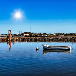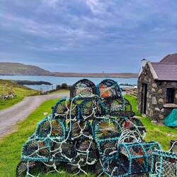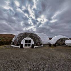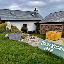 We nemen de gok en rijden links het terrein op. Drie enorme witte koepels staan naast een oude witte boerderij met geel geverfde kozijnen en deuren. Tegen de boerderij aan staat een grote witte container met daarnaast een eenvoudig afdak van hout. Op de wand prijkt een schildering van mannen in een roeiboot op een woeste zee, met de tekst “The tradition of coastal rowing races”. Op de deur hangt een slordig handgeschreven briefje: “We zijn open, bel ………… James”.