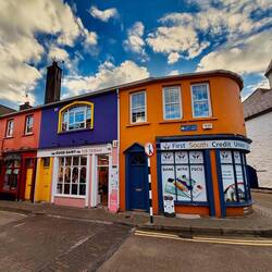 Langs Wexford (oorspronkelijk een Vikingnederzetting), via Waterford (nog zo’n Vikingstadje) en het mondaine Cork rijden we naar het piepkleine, kleurrijke havenstadje Kinsale. De rit voert door een glooiend, groen landschap. De zon schijnt stevig, de stadjes ogen charmant maar hebben ook dat typische verweerde, wat groezelige randje dat een industrieel havenstadjes eigen is.