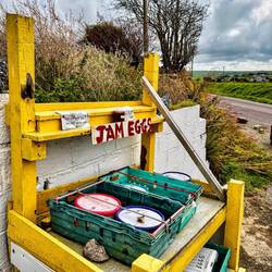 Eergisteren scoorde ik bij een stalletje langs de weg een potje appel-rabarberjam. Een likje op een getoast broodje, koffie erbij — en het ontbijt voor vandaag is geregeld.