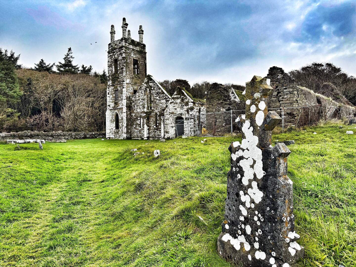 Vandaag staan er twee wandelingen op het programma. Eerst keren we terug naar Castlefreke House. De wandelroute slingert langs het kasteel, door bos, en voert naar de ruïne van Rathbarry Church met de oude begraafplaats.