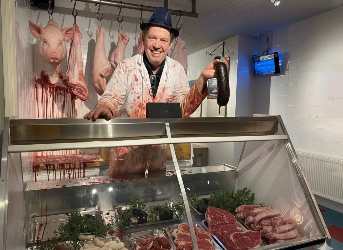 Ja, een echte beleef-het-mee attractie. Heel leuk. Wit schort aan, witte laarzen maat 46 en een chirurgisch haarnetje liggen al klaar. We mogen zelf een varken met een scherp slagersmes slachten, bloed in een metalen emmer opvangen en er dan een worst van koken in grote pannen. Beetje een smeerboel, zwaar werk maar heel geinig om te doen…