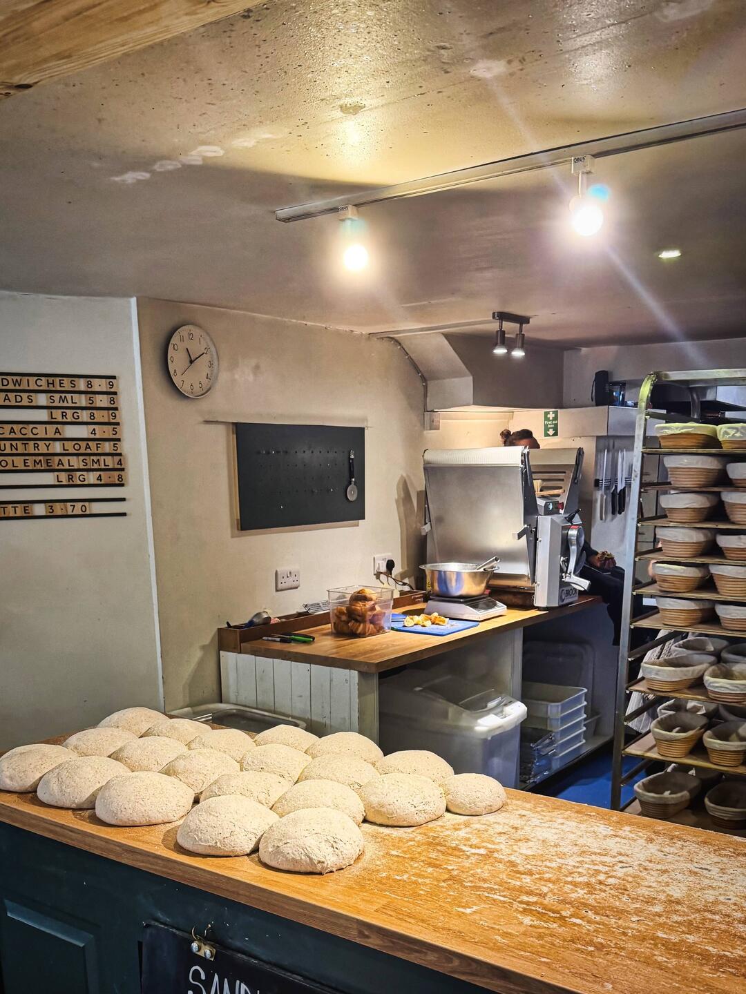 In Clonakilty stoppen we even bij de lokale zuurdesembakkerij. Een sneetje brood met rundvlees van de BBQ, een sausage roll, en een broodje met prei en ricotta. Op de toonbank staan de rijsmanden al klaar voor de volgende dag. Er wordt hier nog gewerkt met geduld en desem.