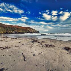 We trekken alle regenkleding aan bij het ontbijt en stappen in de auto. Onze eerste bestemming: Owenahincha Beach. We lopen over het strand richting de rotsen, in de hoop via een route langs de kliffen bij Warren Beach uit te komen. Maar het weer gooit roet in het eten — wind en regen slaan ons nat, alles loopt en drupt. We geven het op en keren terug naar de auto.