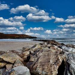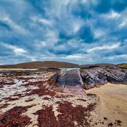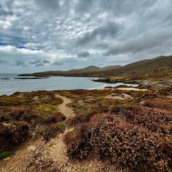 We parkeren bij het huis, nemen een gortdroge koffiecake in het theehuis van Derrynane House en wandelen het strand op van Derrynane. Het zand glanst nog nattig van de vloed. Voor ons loopt een smalle strook zand naar Abbey Island. Je kunt er alleen komen als de zee zich even terugtrekt, alsof de oceaan kort toestemming geeft.