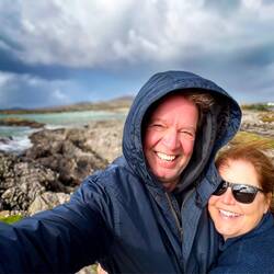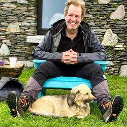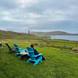 We maken een stevige wandeling van twee uur over de bergen van het eiland en keren via een kustpad terug. Een halve kilometer voor de kabelbaan zien we een bord met de woorden cappuccino, lemoncake en portercake. De eigenaresse komt naar buiten, een lange, slanke vrouw van begin vijftig. Ze leidt ons naar haar tuin met een waanzinnig uitzicht over de baai. Daar staan een paar blauwe Adirondack-stoelen en een oude zwartmetalen schommelstoel. Ze heet Sheila O’Callaghan. Haar hondje Panda stelt zich aan mijn voeten op en gaat daar niet meer weg.
