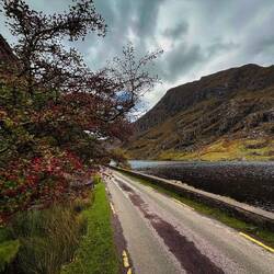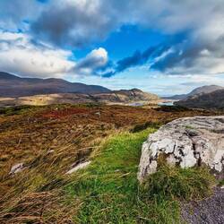 Om negen uur sluiten we de deur van ons huisje in Kenmare. De ochtendnevel hangt nog licht in het dal, alsof de bergen een laatste slok slaap nemen. We rijden noordwaarts omhoog richting Moll’s Gap. De pas slingert zich door de bergen en met elke bocht ontvouwt zich een ander panorama: diepe valleien, glinsterende meren en in de verte de grillige toppen van de MacGillycuddy’s Reeks. Het weer speelt hier zijn eigen spel; zon, mist en wolken wisselen elkaar af alsof iemand voortdurend aan de lichtknop draait. Elke bocht geeft een ander gezicht: meren fonkelen in de diepte, toppen tekenen hun silhouet tegen de lucht en wolken schuiven in seconden van licht naar schaduw.