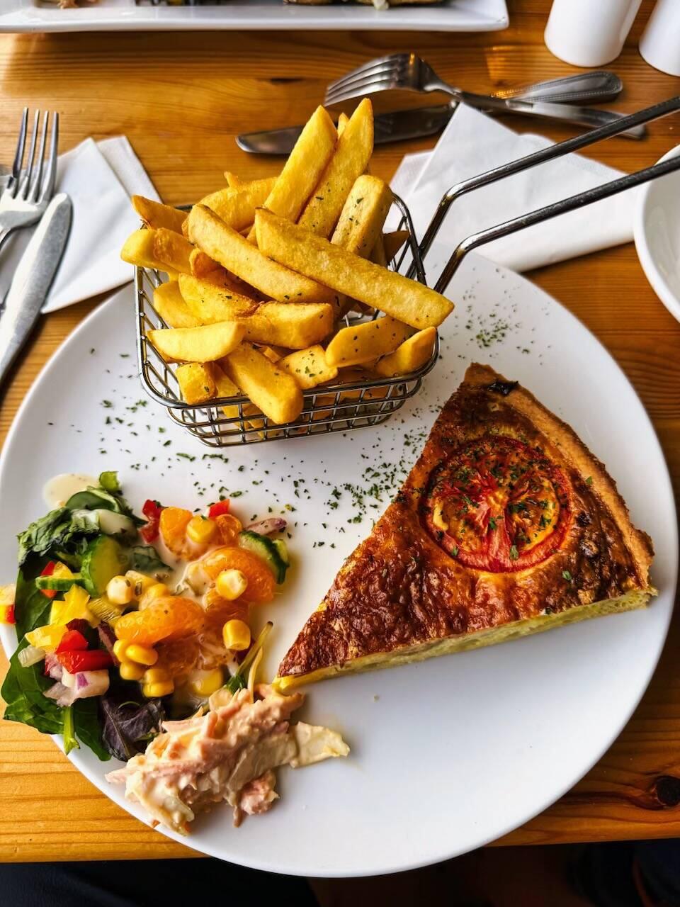 ‘s Middags hadden we gehoopt op de tip van Yvette van Boven: vis eten bij The Fish Basket. Maar helaas — ook op vakantie. We gaan voor de tweede keus: The Glandore Inn. Bij het haardvuur voelen we ons herboren en de fish & chips smaken voortreffelijk.