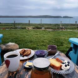 Sheila neemt mondeling haar menukaart door. We kiezen de taarten, thee en koffie: een cake met rozijnen gedrenkt in Porterbier en een cake doordrenkt met limoensiroop. Ze smaken verrukkelijk. Sheila komt uit Cork, woonde ooit in Brazilië, werd daar op haar negenenveertigste op straat ontdekt als fotomodel, verhuisde vanuit São Paulo naar dit eiland waar nog maar drie vaste bewoners wonen. Ze reist nog steeds de wereld over voor fotoshoots, zit in de gemeenteraad van Cork County en bakt elke dag verse cake voor wandelaars.