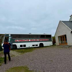 Het eiland hangt vol met recalmeborden van "Valentia Bee Ded". Als we er langs rijden besluiten we toch even te gaan kijken. Op een rommelig stukje land staat een oude verrotte touringcar die is bestikkerd met zwarte letters: Aleternative Healing Experiences. De eigenaar komt uit zijn huisje. "Do you sell Honey?" vragen we. "Sure" en hij opent de grote trouingcar door hard aan de deur te trekken. In de bus is een winkel gebouwd en achterin een ruimte voor healingsessies. We proeven de honingen van het eiland en kopen de lekkerste. Maar wat is "Bee Bed"? vragen we. Dat blijkt een therapievorm te zijn waarbij je op 6 bijenkorven slaapt. Het geluid, de geur en de trillingen van de korf zouden moeten zorgen voor een therapeutische werking. Rebirth on Beehive, zeg maar. Eeuwenoud volgens de eigenaar. En hij heeft zo'n hutje waarin je dat ondergaan voor een nachtje. Ik zie hier mogelijkheden voor mijn dagelijks werk. Binnenkort eens bespreken binnen RWS.