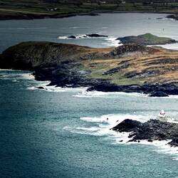 We zetten koers omhoog over een oud Mass Path, een pad dat in vroegere tijden door gelovigen werd gebruikt om heimelijk naar katholieke missen te gaan. Langs de kronkelende weg ontvouwt zich steeds meer zeezicht. In de verte duiken Scariff en Deenish Island op, donkere silhouetten in een zilvergrijze oceaan. De zon schijnt inmiddels uitbundig. Dichterbij ligt Lamb’s Island en beneden zien we twee kleine witte torentjes, de zogenaamde “leading lights” van de haven. Wanneer je ze op één lijn brengt, leiden ze schepen veilig naar binnen. Kleine vuurtorentjes die nu haast op kunstwerkjes lijken.