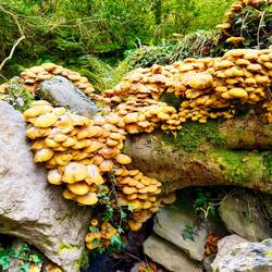 Bij het afdalen lopen we door de Meadow rond het huis. Het gras en het sompige zand veren onder onze schoenen. Naast ons loopt een wild kletterend stroompje richting de zee. Tussen de half verrotte boomstammen groeien grote bossen paddestoelen.