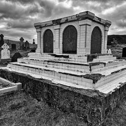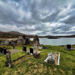 Aan de overkant staan de ruïnes van Derrynane Abbey, muren zonder dak en bogen die recht de hemel in lijken te kijken. Rondom liggen graven, sommige scheefgezakt, andere keurig gerestaureerd. Soms met data uit een ver verleden, soms verrassend recent (2016). De graven staan lukraak verspreid over de begraafplaats, maar ook binnen de muren van de Abbey zelf. Hier rusten onder anderen Mary O’Connell, de vrouw van Daniel O’Connell, de oorspronkelijke eigenaar van het huis.