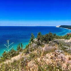 Einddoel van de autorit is Sleeping Bear Dunes. 60 kilometer lang duinlandschap langs de kust van Lake Michigan. Een soort Kennemerduinen op steroïden, zeg maar. Vele malen hoger, langer, breder en ruiger.