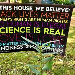 Maar sinds we hier zijn valt toch op hoeveel mensen zich openlijk uitspreken tegen die ontwikkeling. In honderden (misschien wel duizenden) tuinen, op bijna elke gebouw, in elke winkel en bij elk bedrijf spreekt men zich openlijk uit voor een samenleving waarin iedereen mag meedoen, waarin kleurverschil geen probleem zou moeten zijn, waarin de vrouwenrechten (op bijvoorbeeld abortus) niet geschonden worden. Het aantal biologische en vegetarische restaurants en winkels wat we zij tegen gekomen is niet te tellen. En die groep verheft zijn stem. Zoals in Nederland de rechtse-FVD-PVV-Argo-maffia het land vol hangt met omgekeerde vlaggen om te laten zien dat het alleen om hun zelf gaat, op die zelfde schaal hangen hier de "Black Lives Matter"-bordjes en de regenboogvlaggen in tuinen, aan winkels , aan flats, op auto's en zelfs bij kerken. Het het zal ongetwijfeld mijn eigen bias zijn (en ook de keuze die wij maken voor streken en steden), maar het valt wel op. En niemand trekt de bordjes uit de tuin of haalt de vlaggen weg. Daar gaat toch net een iets positievere uitstraling van uit dan een bult stront op de snelweg en een omgekeerde Nederlandse NSB vlag aan je boerderij. Misschien een tip voor ons zelf....laat je horen aan de andere kant....(maar ik weet niet zeker of dat nog kan of dat ik zelf misschien ook wel bang zou zijn voor een steen door de ruit of een bult hooi voor de deur).