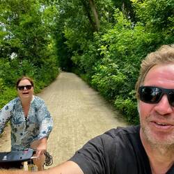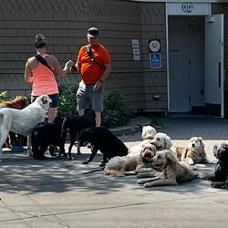 Scene 1 (beetje Desperate Housewives/Sex in de City): Erica en ik gaan een groot gedeelte van de Grand Rounds fietsen. We mogen de fietsen van de huisbaas gebruiken. Minneapolis heeft een prachtig fietsnetwerk om en door de stad. Totaal is de Grand Routes iets van 90 kilometer. Wij fietsen er vandaag 45. T'is minimaal dertig graden. De fietsroute gaat langs zeven grote meren die aan de zuidkant van Minneapolis liggen. Bij één van die meertjes stoppen we voor een bekertje koffie. Terwijl we daar zitten komt er een man in sportkleding aanlopen met zeker acht grote honden bij zich, type Labradoodle. Hij laat de honden allemaal liggen. Doet verder niks. Dan kom er van links nog een vrouw in sportkleding met zeven grote honden aanlopen. Zij voegt zich zonder echt te groeten bij de man en zijn honden. Ik denk, dat is veel. En maak een foto.