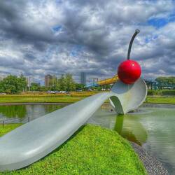 We lopen terug naar ons huis, nog een keer 7 kilometer en komen onderweg in een prachtige tuin met enorme moderne beelden. En wederom: toegang gratis. In het gras maakt een bruidspaar foto's met de familie, met op de achtergrond de iconische "kers op de lepel". Ze vergeten de bruidsmeisjes. Die zitten met hun mooie witte jurkjes en gevlochten haar met kraaltjes uitgeteld op de spierwitte stoelen die her en der in het park staan.