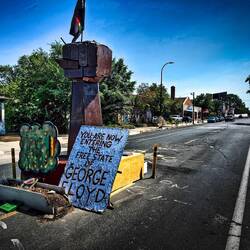 We parkeren de auto vlak voor de kruising en voor ons staat een groot houten beeld van een vuist midden op de weg. Op een bord staat “You’re now entering the free state of George Floyd.” We stappen uit en wandelen de straat in.