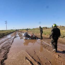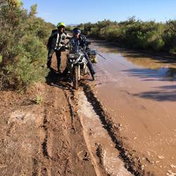 Das alles kam so: die eigentliche Fahrstrecke heute beträgt nur gut 150 km, schließlich soll genug Zeit in Argentiniens Weinparadies Mendoza sein. Phil, Will und Bernd wählen auch die Botega-Option, während Oliver, Manfred, Martin/Katrin und meine Wenigkeit (begleitet durch Marc im Van) beschließen, den Fahrtag durch einen kleinen Ausflug ins Gelände zu würzen. Wir scheitern allerdings mit dieser Idee grandios und zweifach. Nicht nur wegen des beschriebenen nahtlosen Übergangs der gewählten Straße in ein Flussbett, der unserem Tatendrang nach 40 km ein jämmerliches Ende setzt und uns zur Rückkehr auf gleichem Wege zwingt, was als schwere Männerniederlage gelten muss (Tipp übrigens an alle möglichen Nachahmer: niemals Einheimische fragen, ob die Straße befahrbar ist, die Antworten haben bestenfalls Unterhaltungs-, jedoch keinerlei Informationswert). Sondern auch, weil wir zuvor schon mit der Routa 5 eine fragwürdige Wahl getroffen hatten, die uns mit schwierigen Matschpassagen konfrontiert.