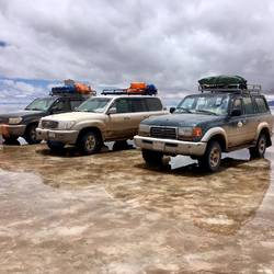 Natürlich muss man das gesehen haben, es ist grandios, im Grunde sehr ruhig und vor allem skurril. Da wir in der Regenzeit unterwegs sind, steht auf der festen Salzkruste das Wasser. An ein Befahren mit den Bikes ist nicht zu denken, aber den Fahrkünsten von Miguel mit seinem Landcruiser kann man sich anvertrauen. Er beschallt uns auf dem Weg zum früheren Salzhotel, etwa 6 km vom Ufer entfernt, mitten auf dem See, mit Ramstein (Mutter! Bück dich!). Bizarrer könnte die Situation kaum sein.