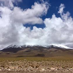 Es ist nicht so, dass eine Tour durch Südamerika ausschließlich aus interessanten Streckenabschnitten bestehen würde. Während der heutigen 400 km Etappe von San Pedro de Atacama in Chile nach Purmamarca in Argentinien beispielsweise geht es ziemlich lange geradeaus. Was dazu führt, dass man auf dem Motorrad über allerlei nachdenken kann. Zum Beispiel darüber, ob man wirklich halten sollte, um den namenlosen Vulkan des ersten Bildes aufzunehmen, der vermutlich weit über 6.000 m hoch ist, was natürlich irgendwie sensationell ist. Wenn man allerdings schon 50 km in 4700 m Höhe bei 4 Grad gefahren ist, dann bedarf es minutenlanger Abwägungen um zu entscheiden, ob man tatsächlich die Hände von den beheizten Handgriffen nehmen sollte (ein dreifaches Hoch auf den Ingenieur, der diesen segensreichen Einfall hatte), ob man dann die Jacke öffnen sollte, um das IPhone herauszuzerbeln und ob man anschließend mit erhöhter Geschwindigkeit und damit einhergehend erhöhtem Chill-Faktor der Gruppe hinterher hecheln sollte. Ich bitte also um ein kleines Schulterklopfen für dieses erste Bild, auch wenn es sicher kein fotografisches Meisterwerk ist.
