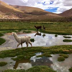 Und übrigens: Warmes Wasser gibt es in Chile auch, in den Duschen und auf 4.400 m Höhe, denn vormittags fahren wir eine Schleife über ein Geysir-Gebiet names El Tatio. Es ist nicht gerade Yellowstone, schon gar nicht was die Besucherzahlen anbelangt, aber es sprudelt und dampft in der Hexenküche durchaus ordentlich. Vor allem aber gibt uns der "Umweg" (macht das Wort Umweg auf Reisen überhaupt Sinn?) erneut die Gelegenheit, weite Hochebenen und herrliche Vulkanlandschaften zu betrachten.