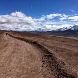450 km stehen auf dem Programm, von Colchani nach Calama. Es prasselt erneut die halbe Nacht auf das Wellblechdach des Hotels (wenn man es als solches bezeichnen mag). Internet ist weg, Dusche ist kalt, Frühstück um 6 Uhr nicht fertig, trotzdem Abfahrt um 7 Uhr. Selbst wenn wir eine durchschnittliche Geschwindigkeit von 50 km/h erreichen, bedeutet das 9 Stunden reine Fahrzeit. Plus Grenzübergang von Bolivien nach Chile. Plus keine exakte Information darüber, wie die Anteiligkeiten "mud", "gravel" und "paved" sein werden.