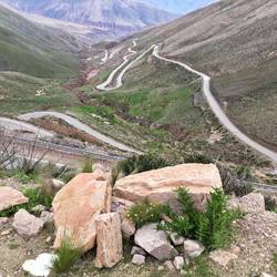 Zum Schluss dann doch noch Kurven, wir wedeln von 4.200 m auf 2.200 m hinab und enden in einer grünen Oase mit buntem Gestein um uns herum. Übrigens noch ohne argentinisches Geld, denn der Geldautomat in Purmamarca ist leer und wird heute -karnevalsbedingt- nicht mehr aufgefüllt. Alaaf!Baca lagi
