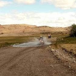 Im 11 km langen Niemandsland zwischen Chile und Argentinien wird der Schotter weich und tief. Das wird leider Phil zum Verhängnis, er stürzt und verstaucht sich den Fuß. Sein Bike wird in den Van verladen und er selbst muss im Tourbus die Beifahrerrolle einnehmen, was ihn verständlicherweise tieftraurig stimmt. Auch der Rest der Gruppe kämpft die folgenden zwei Stunden ab der argentinischen Grenze mit den Bedingungen - immer wieder fahren wir unverhofft in weiche Sandpassagen und tiefe Kiesfurchen. Eine fette Pfützendurchfahrt ist auch dabei.