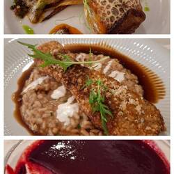 Mittagessen gab es dann später natürlich auch (Kandierter Fenchel, Speck und geräucherter Paprika - panierter Schweinebauch mit Risotto und Knoblauchcreme - schwarze Johannisbeer-Pannacotta), wahnsinnig lecker!