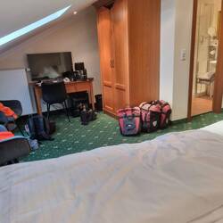 Heute gibt es nicht viel zu erzählen. Und ich kam gar nicht dazu, Fotos zu machen😨. Ich mag Euch nicht immer nur Strasse und Waldfotos zeigen. Mehr zu sehen gab es nicht. Nur dass wir ohne Frühstück starteten und uns später in einer Konditorei ein Stück Zwetschgenkuchen und den fehlenden Kaffee gönnten. Es war wie die letzten Tage auch - Hügel über Hügel, gegen Mittag und am Nachmittag extrem heiss. Man merkt, dass wir immer noch im Ausläufer vom Fichtelgebirge sind. Hof liegt im äussersten Nordosten von Bayern und der Dialekt hier ist nicht mehr der bayerische wie wir ihn kennen, sonder oberostfränkisch mit starken Einflüssen aus dem Vogtland! Aber morgen verlassen wir nach etwa einer Stunde Bayern und wechseln ins Bundesland Sachsen. Da lassen wir das Fichtelgebirge langsam hinter uns und wechseln ins Erzgebirge. Was kommt da einem in den Sinn? Weihnachten - Schwibbögen, Weihnachtspyramiden, Räuchermännchen.... ja, und wir sind gespannt, ob das Hügelderby dann endlich aufhört. Heute haben wir uns in Hof ein Viersternehotel geleistet - natürlich liegt es oben am Berg, was denn sonst. Und sollten wir uns heute noch zuwenig sportlich betätigt haben🥵, haben wir die Möglichkeit, die hauseigene Indoor-Golfanlage zu geniessen. Ha, ha, ha.... wir haben unsere Räder nochmals gesattelt (ohne Gepäck) und sind ins Städtchen runter gefahren und später wieder den Hügel rauf🤪. Und nun ist finito mit bewegen - nur noch schlafen😴.Leia mais
