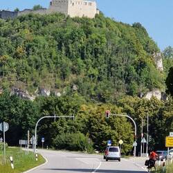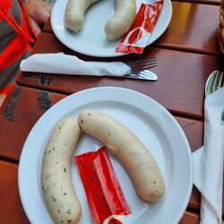 Heute sind wir um 7.54 Uhr, gleich nach dem Frühstück gestartet. Nachdem uns Google zuerst auf eine Pflastersteinpiste geschickt hatte, wechselten wir auf die Strasse, die wenig später in einen aktzeptablen Radweg überging. Wir querten die Donau über eine grosse Brücke und fuhren danach der Naab entlang, immer schön in der entgegengesetzten Richtung wie der Bach floss. Also aufwärts. Aber immer nur leicht steigend. Das konnte das Wetter doch nicht akzeptieren, darum schickte es uns einen nicht heftigen aber doch ziemlich starken Gegenwind. Aber das kann uns seit Kanada und USA nicht mehr erschüttern. Wir fuhren also durch das wunderschöne Naabtal, vorbei an grünen Wiesen, auf denen immer wieder Obstbäume standen, behängt mit Äpfeln wie ein Weihnachtsbaum (nein, ich habe keinen geklaut, mein Magen, der eh spinnt, hätte das nicht gedankt). Es ging stetig ein bisschen obsi. Theo meinte dann irgendwann, sobald eine Tankstelle kommt, werden wir pumpen. Es kam eine Tankstelle, die Pumpstation war noch etwa einen Meter entfernt, da machte es bei Theo (also nicht bei ihm, sondern bei seinem Rad) pfffff..... und keine Luft mehr im Reifen😨. Und das hinten. Also, gesamtes Gepäck abladen, Rad mit Kette und Übersetzung weg, Schlauch raus, Schlauch rein, alles wieder zusammensetzen und nach 25 Minuten war das Velo wieder fahrbereit! Weiter ging es aufwärts, der Wind kam schön von vorne, die Rennradfahrer in der entgegengesetzten Richtung bretterten mit einem 40iger an uns vorbei - herrlich für die! Irgendwann fand Theo dann, wir hätten eine Pause verdient und fuhr auf einen Parkplatz schon an der Vils, dem nächsten Fluss nach der Naab. Was ER nicht sah, ich aber schon, war eine Gartenwirtschaft etwa 100 m entfernt. Also fuhren wir dort in den Gastgarten und verflixt nochmal, ich wollte endlich mal eine Weisswurst, obwohl ich keinen Hunger hatte. Die Bayern sind da sehr stur, nach 12 Uhr gibt es keine Weisswürste mehr, aber da es erst zwanzig vor zwölf war, hatten wir Glück. Das Gasthaus hatte eine eigene Metzgerei und die Weisswürste waren so etwas von guad😁..... die Chefin kam dann noch zu uns raus und erzählte, dass ihre Blaskapelle Dietldorf mit Weiterdingen befreundet sei und sie sich immer gegenseitig besuchten. Weiter ging es durchs Vilstal, nach wie vor obsi und Gegenwind, aber irgendwann kamen wir doch an unser Ziel, Amberg. Das Städtchen Amberg (wirklich am Berg) liegt östlich von Nürnberg und näher an der Grenze und da wir ja der Grenze entlang radeln wollen, lassen wir Nürnberg links liegen. Nach dem Alphüttenbezug (wir hatten im Hotel Mariandl am Berg gebucht, unser Zimmer hiess Berghütte und hatte natürlich auch wieder abgeschrägte Wände) löschte Theo seinen Durst mit einer Mass Bier. Im Gegensatz zum Oktoberfest kostet hier so eine Mass unter 10 EUR. Noch etwas zur Figur ganz am Anfang: während der Priester seine Schäfchen (in diesem Fall seine Gänse streichelt) frisst hinter seinem Rücken der Fuchs eine Gans!Leia mais