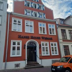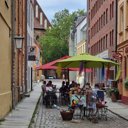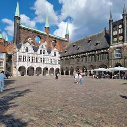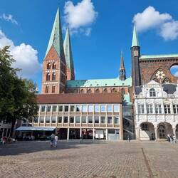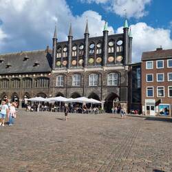 Wir wählten also den Radweg an der Ostsee entlang. So nahm das Unheil seinen Lauf. Statt flach wie gedacht, führte der geteerte Radweg 25 Kilometer rauf und runter, rauf und runter. Und dies bei 870 Höhenmetern bis Travemünde. Die Gegend war zwar sehr schön, leider sah man die Ostsee nur immer zwischen Bäumen und Sträuchern hindurch. Nach zwei Stunden kamen wir dann in Travemünde bei der Fähre an, die grade beladen wurde und auf der wir auch noch einen Platz ergattern konnten. So hatten wir eine nahtlose Überfahrt mit einer Dauer von 5 Minuten von der Ankunft bis zur anderen Seite. Da gab es dann zuerst einen Teller Spaghetti, bevor wir Richtung Lübeck aufbrachen. Wir fuhren der Pötenitzer Wieck entlang, kamen an der Grenzdokumentations-Stätte Lübeck- Schlutup vorbei und erreichten im Laufe des Nachmittags Lübeck. Leider war hier einmal mehr ein grosses Hindernis, dass gebaut wird und die eine Brücke nicht einmal für Radfahrer passierbar war. So mussten wir wieder einen Umweg fahren. Aber wir kamen im Hotel an und da heute entgegen unseren morgendlichen Befürchtungen, dass die schwarzen Wolken Regen bringen würden, die Sonne ziemlich heiss vom Himmel knallte, war zuerst ein Bier fällig. Nachher ging es dann wieder einmal mit dem schweren Gepäck und ja, auch nicht mehr so leichten Beinen, einige Treppen hinauf bis unters Dach. In Zukunft werden wir fragen, ob das Hotel einen Lift hat, sonst buchen wir nicht. Das brauchen wir echt nicht, dass wir nach knapp 100 km radeln noch so viele Treppen hinaufsteigen müssen. Aber wenigstens haben wir uns dann die sehr schöne Altstadt von Lübeck angeschaut und dabei die Beine etwas vertreten. Morgen nun gehts nach Hamburg.
