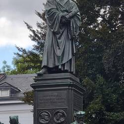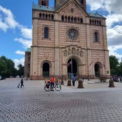 Also, da fuhren wir wieder dem Rhein entlang, eine Skulptur mit Vögeln musste ich unbedingt fotografieren und auch den träge dahinfliessenden Rhein, während die Flussschiffe noch untätig am Platz lagen, die Menschen drin aber schon frühstückten. Wenigstens die einen, bei anderen waren die Vorhänge in den Kabinen noch zugezogen! Irgendwann kamen wir an einem Weinverladekran von 1745 vorbei. Das gab es damals wirklich schon. Die Wolken rissen etwas auf, das Wetter wurde besser, aber nicht lange, da ballte sich vor uns eine schwarze Wand auf. Wir beeilten uns, um Mainz noch trocken zu erreichen. Aber wir hatten kein Glück, es fing an zu tröpfeln und als wir den Aufstieg zur Brücke in Angriff nahmen, fing es an zu schütten. Klar, es durfte ja nicht sein, dass wir trocken im Hotel Hilton einen Kaffee bekamen. Wir hätten ja gerne dort gebucht statt in Rüdesheim, aber wegen der Messe war nichts zu machen. Wir bekamen aber von einer ganz netten Chefin einen Kaffee und konnten uns etwas aufwärmen und unsere nassen Kleider trocknen. Als der Regen nachliess, der Horizont heller wurde und wir nicht mehr pitschnass waren, fuhren wir weiter. 15 km lang war der Radweg echt ein Traum, der sich aber zu einem Alptraum entwickelte. Mussten wir doch 13 km ganz nah am Rhein entlang auf einem Feld-, Wiesen- und Waldweg fahren, der uns ordentlich durchschüttelte. Und als wäre das noch nicht genug, schickte uns der liebe Gott wieder einen heftigen Regenschauer - wir waren grade so richtig trocken. Aber nicht mit uns - wir kamen an eine Grillstelle mit Häuschen und konnten uns und die Velos unterstellen resp. sitzen. Zwei Minuten vorher ging allerdings in der Industrie, die sich weiter drüben befand, ein Alarm ab und auch unsere Handys hornten wie von Sinnen. Ich wäre fast vom Velo gefallen, aber der Blick auf die Nachricht besagte, dass es ein Probealarm wäre. Auch dieses Mal ging der Regenschauer so schnell wie er kam, vorbei. Wir konnten weiterfahren, mussten wir doch noch 40 km bis Worms trampen. Ein Stück weit ging es auch noch rauf und runter durch die Rebberge. Auf die angebotene "Rieslingtour mit Velo" verzichteten wir. Mit den üblichen Baustellen, Rüttelpisten und einem ganz langen Radweg, toll geteert, dafür voll im heftigen Gegenwind, kämpften wir uns durch. So Gegenwind zerrt an den Kräften und die Geschwindigkeit reduziert sich deutlich. Je näher wir Worms kamen, je schwärzer wurde es wieder. Wir sahen uns an - klar, wir müssten doch nochmals eine Schikane bekommen, bevor wir das Hotel erreichen. Die Schikane kam, aber nicht in Form von Regen sondern weil wir und andere Radler wegen der Baustelle am und somit gesperrten Radweg auf eine zweispurige Strasse ausweichen mussten. Beim Ortsrand von Worms dann gab es nochmals eine riesige Baustelle, die wir alle trotz den arbeitenden Strassenbauern durch Baumaschinen und Lastwagen durchquerten. Etwas anderes war nicht möglich. Und so erreichten wir trocken! unser Hotel am Dom. Wahnsinn, wie jede Stadt ihren Dom hat und zwar extrem gross. Bei diesem Dom hängt die Orgel oben an der Decke - Charlotte, das wäre eine Herausforderung für Dich zum spielen😁.Okumaya devam et