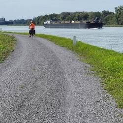 Der Morgen begann wie immer - nach einem tollen Frühstück, bewacht von mindestens 30 Polizisten (die waren wieder mal im gleichen Hotel wie wir untergebracht) fuhren wir der Stadt Meppen und somit der holländischen Grenze entgegen. Was uns beim Blick aus unserem Zimmerfenster erstaunte, waren unzählige Radfahrer, die nach Leer zur Arbeit fuhren! Wir fuhren dann auch los und mussten auf einem ganz engen Radtrail, der kein Kreuzen ermöglichte, den Fluss Leda überqueren, der danach in die Ems fliesst. Es ist immer herrlich, so früh am Morgen zu fahren, Ruhe, Sonne und eine interessante Gegend machen das Radfahren zum Vergnügen. Und wenn man dann irgendwann noch an einen Kürbisstand kommt, wird einem bewusst - der Herbst kommt bald. Und sooo einen riesigen Kürbis sieht man selten. Ich hätte ihn gerne mitgenommen, aber der Platz auf dem Velo war zu klein. Wir überquerten wieder einen Fluss, die Ems, und der Frachter, der zur gleichen Zeit unter uns durchfuhr, faszinierte mich. Bald kamen wir in der Nähe von Dörpen an eine Leitung, von der wir nicht wussten ist es Wasser, Eisenbahn oder ein Radweg für uns? Wäre zwar schwierig gewesen, dort hochzukommen😆. Es ist eine 380-kV-Leitung Wesel–Dörpen, die sich zurzeit in der Realisierung befindet, genannt Drehstrom-Höchstspannungs-Freileitung für zwei 380-kV-Stromkreise, die in ihrem Endausbau von der Umspannanlage Niederrhein bei Wesel in Nordrhein-Westfalen zum Umspannwerk Dörpen-West bei Heede in Niedersachsen führen wird.