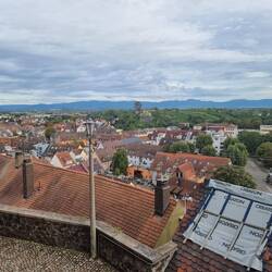 Die letzte Nacht war für alle Hotelgäste speziell. Es regnete und stürmte dermassen, dass man meinte, die Welt geht unter. Wir erwachten morgens um drei Uhr und konnten uns nicht vorstellen, dass wir in ein paar Stunden aufs Rad steigen würden. Einer der Gäste, der sein Zimmer unter dem Dach hatte, erzählte beim Frühstück, dass er so etwas selten schon erlebt habe. Aber oh Wunder, am morgen verzogen sich die Wolken, stellenweise war blauer Himmel zu sehen und so machten wir, dass wir auf und davon kamen🚴♂️💨🚴♀️💨. Es hellte immer mehr auf, bald kamen wir an eine Tankstelle, konnten unsere Bidons auffüllen und wieder einmal pumpen. Und was hatte es da? Ein Häuschen mit DREI Waschmaschinen - genau das, was wir uns während der ganzen Reise gewünscht hatten, aber nie fündig wurden. Bis auf das eine Mal in Stralsund, wo wir die Wäsche abgeben und am Abend wieder fixfertig gewaschen und zusammengelegt bekamen, mussten wir alles von Hand waschen. Unsere Waschmaschine zuhause bekommt Arbeit😆! Also, das Wetter machte, was es wollte, mal schien die Sonne, dann wieder zogen schwarze Wolken gegen uns, einmal fing es an zu tröpfeln und wir flüchteten in eine Bäckerei. Theo ass dort eine sagenhaft gutes Schnitte. Ein Bisquitboden mit Pistache gebacken und darauf eine Himbeermousse. Dieses feine Gebäck werde ich zuhause nachbacken😋. In der Zwischenzeit klarte der Himmel wieder auf, während links im Schwarzwald und rechts in den Vogesen die Wolken noch weit herunterhingen. Vorbei ging es an Rust. Von weitem schon sah man die Bahnen und Gebäude. Die unzähligen Hotels, Ferienwohnungen und B&B's liessen uns staunen. Bald nach Rust kamen wir schon an den Kaiserstuhl. Rebberge, so weit das Auge reicht. Wir sind ja immer wieder mal im Elsass und am Kaiserstuhl, da Theo's Mutter von Strassburg stammt und noch einige Verwandte hier leben. Allerdings sind wir heute auf der deutschen Seite gefahren und haben die Verwandtschaft ausgelassen. Wir waren ja erst im Frühling zu Besuch dort. Und da wir im Elsass fast jede Ecke kennen, mussten wir kein Sight Seeing mehr machen. Der Weg führte uns durch die Rebberge mit moderaten Steigungen und als Belohnung gab es dann eine Abfahrt nach Vogtsburg. Schliesslich kamen wir trocken in Breisach an. Vor dem Abendessen liess ich es mir allerdings nicht nehmen, noch etliche Höhenmeter zu Fuss zum Münster hinaufzusteigen, was mich mit einer herrlichen Aussicht belohnte.Okumaya devam et
