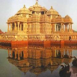 Der Akshardham-Tempel ist ein riesiger, moderner hinduistischer Tempelkomplex, der als größter hinduistischer Tempel der Welt gilt, bekannt für seine Architektur aus rosa Sandstein und weißemLäs mer