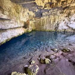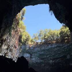 Wir werden wieder auf den Boden der Tatsachen entlassen und verlassen die Höhle. Kurz danach folgen wir dann noch einem griechischen Pärchen durch ein Loch im Zaun in eine ähnliche Höhle. Der See hier muss allerdings flacher gewesen sein, denn Wasser sieht man nur am Rand. In der Mitte türmt sich dafür ein kleiner Hügel auf, der mit allerlei Pflanzen bewachsen ist - vermutlich die alte Höhlendecke. Das Echo probieren wir hier lieber nicht aus - nicht dass noch mehr einstürzt. Satt gesehen machen wir uns auf den Weg zur Unterkunft in Sami.Read more