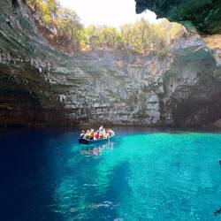 Wir machen also zuerst einen Abstecher zur Drogarati Höhle. Wir haben Glück weil wir gerade den mit duzenden Touristen gefüllten Bus abfahren sehen und so die vielen Stalaktiten fast allein betrachten können. Die nächste Höhle ist aber das wahre Highlight. Nordwestlich von Sami liegt die Mellissani Höhle, die einen See in sich verbirgt. Vor ca 5.000 Jahren (so erzählt uns der Guide) ist die Höhlendecke eingestürzt. So entstand direkt über dem See ein großes Loch, welches den See bei Sonnenschein in seiner ganzen blauen Pracht erstrahlen lässt. Mit eine Ruderboot werden wir und ein paar andere Touristen eine Runde um den See geschippert und bekommen einige Informationen zur Höhle. In einem Teil ist die Decke noch intakt und produziert ein wunderbares Echo, welches von unserem Guide per Gesang demonstriert wird. Ziemlich cool!