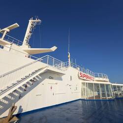 Die Fähre geht um 14:30. Zu erst müssen wir allerdings von Kefalonia zurück nach Patras kommen. Wir nehmen also die erste Fähre um 8:30 und erreichen um 12 Patras. Dort begeben wir uns direkt zur Ticketverkaufsstelle und dann zum anderen Hafen, denn Pässe müssen kontrolliert werden. Eine Stunde vor Abfahrt erreichen wir das Schiff - die Superfast XI. Durch die Laderampe am Heck betreten wir den Laderaum unter Deck. Unsere Räder verstauen wir in einer Art Container, neben den LKWs und Autos. Nach oben geht’s, zu den Schlafräumen, Cafés und Restaurants. Wir laden unseren Kram im Schlafraum mit den Sesseln ab und machen eine erste Tour durchs Schiff. Auch ein „Casino“ haben sie, in dem man sein Geld an Automaten verlieren kann. Naja.