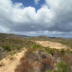 Nach einer weiteren etwas längeren Strecke an der Küstenstraße biegen wir wieder ins Niemandsland ab. Der Schotterweg, über den wir holpern, ist erst gesäumt von Millionen Glasscherben - wohl Flaschen die Opfer von Schießübungen geworden sind. Später fahren wir vorbei an allerhand Müll (Kühlschränke, Autos usw) der als Zielscheibe dienen musste. In der Hoffnung, dass gerade keiner üben möchte, fahren wir vorbei am Schießplatz und erreichen damit das Ende des Weges. Nun gibt es nur noch einen Trampelpfad aus groben Geröll der einen garstigen Anstieg hinauf führt, der selbst Flo zum Schieben nötigt. Ich fluche mich nach oben.